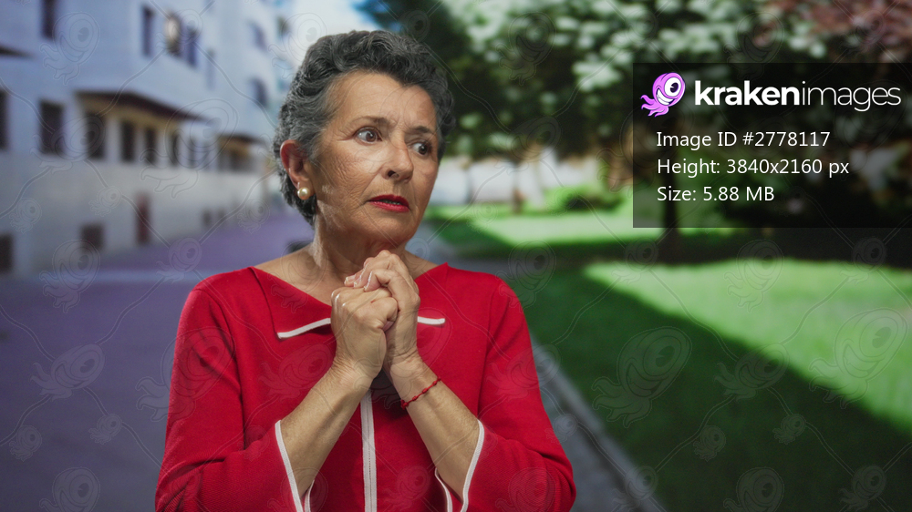 Senior woman with grey hair and red sweater appears worried on a city street, symbolizing urban life and emotion amidst a modern architectural backdrop. - Kraken Images