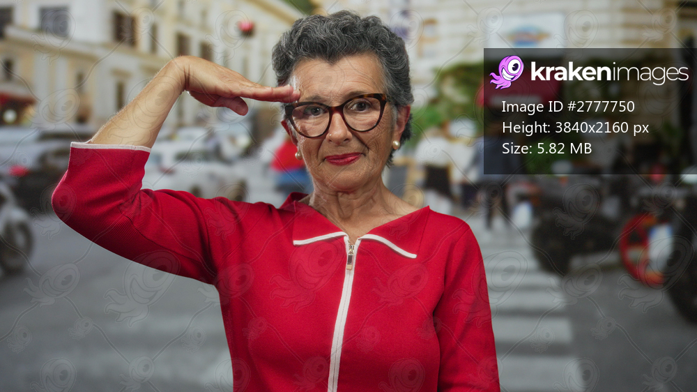 Senior woman with grey hair salutes on a bustling city street, wearing a red outfit, radiating confidence and charm in an urban outdoor setting with people in the background. - Kraken Images