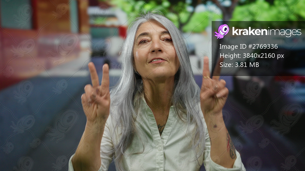 Senior woman with grey hair smiles in casual white shirt, standing outdoors on a street showing peace sign with an urban background of trees and cars.