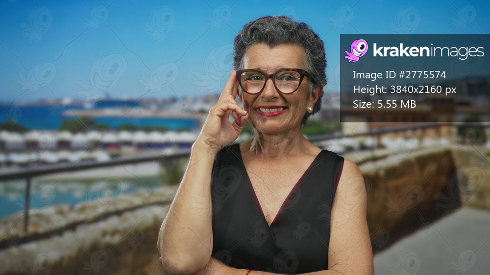 Senior woman with grey hair smiling confidently at the seaside promenade, surrounded by picturesque sea views and beach atmosphere.