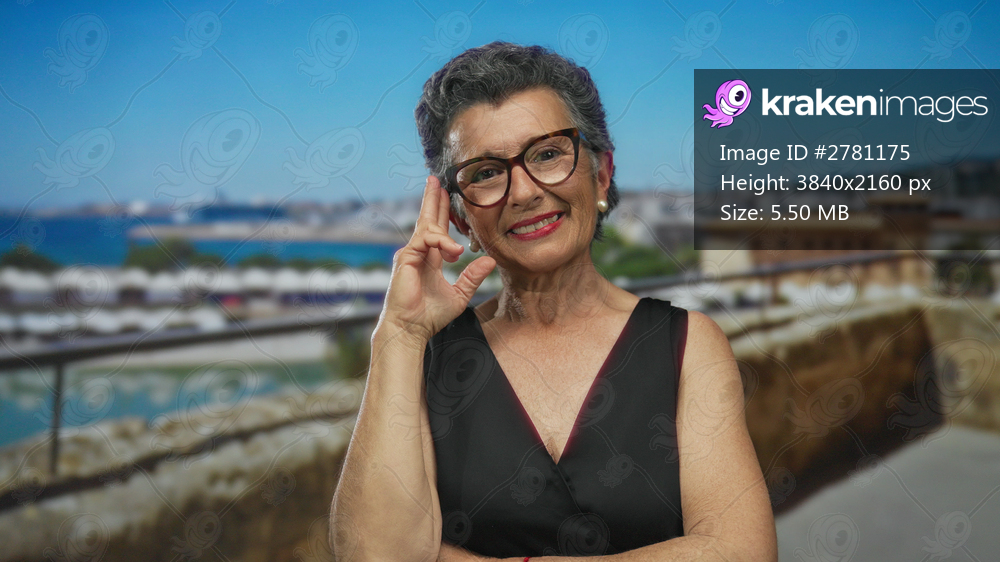 Senior woman with grey hair smiling confidently at the seaside promenade, surrounded by picturesque sea views and beach atmosphere.