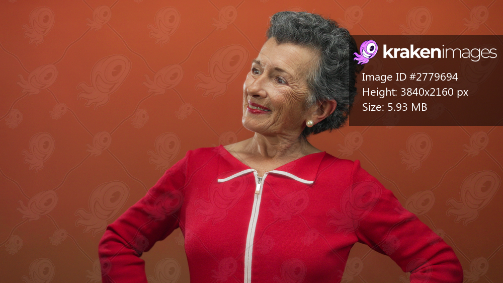 Senior woman with grey hair smiling confidently in a vibrant red outfit against an orange background, exuding elegance and poise in a studio setting.