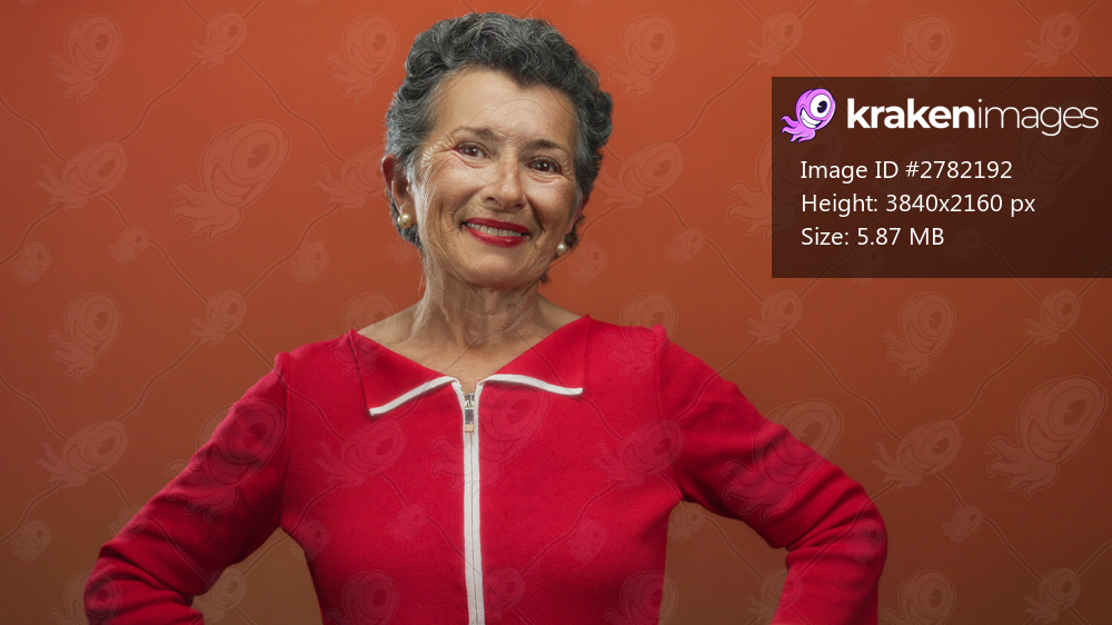Senior woman with grey hair smiling confidently in a vibrant red outfit against an orange background, exuding elegance and poise in a studio setting.