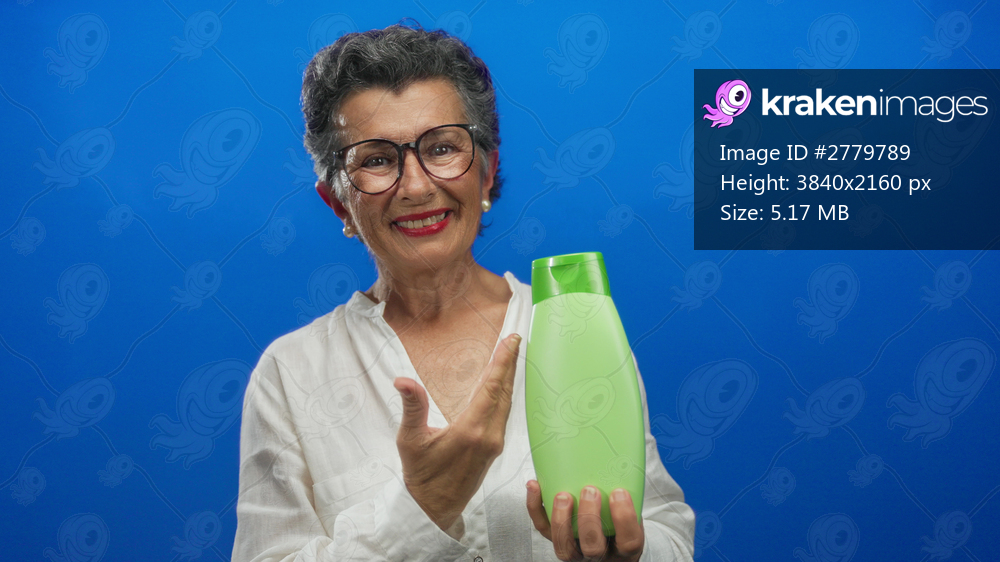 Senior woman with grey hair smiling and holding a green shampoo bottle against a blue background, highlighting her joyful expression and emphasis on haircare products. - Kraken Images