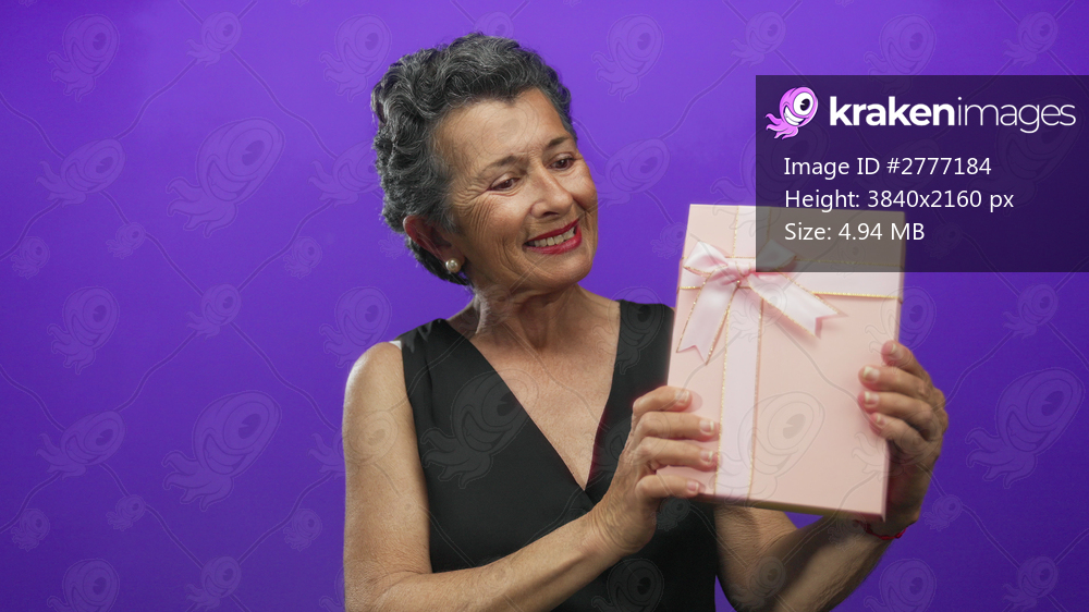 Senior woman with grey hair smiling and holding a pink gift box against a vibrant purple background, showcasing joy and celebration.
