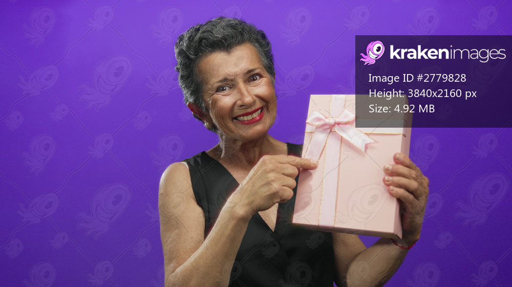 Senior woman with grey hair smiling and holding a pink gift box against a vibrant purple background, showcasing joy and celebration.