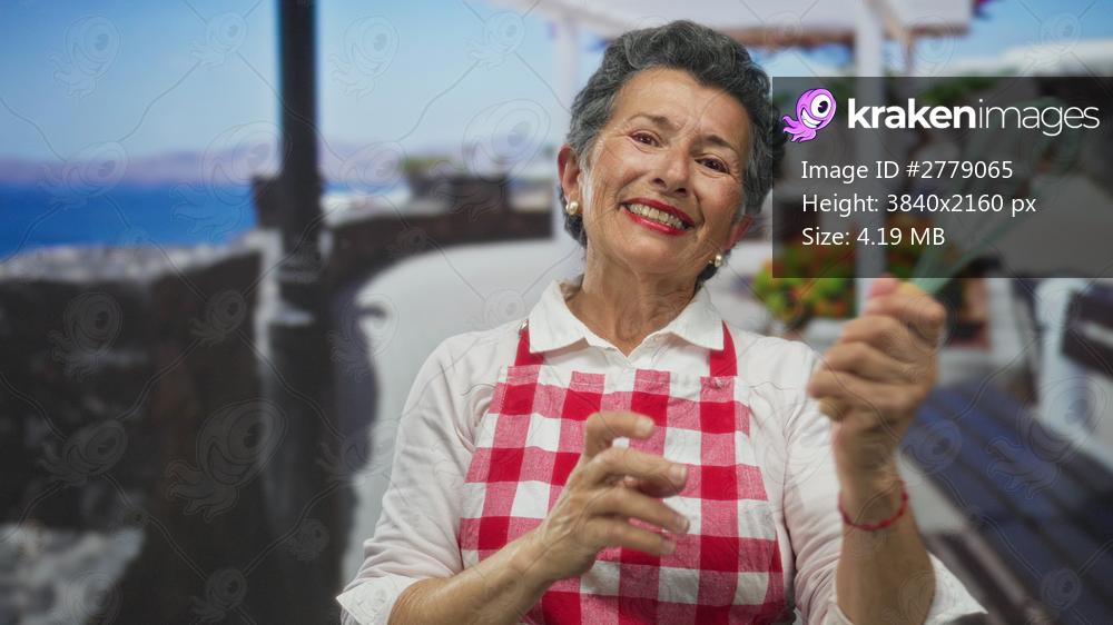 Senior woman with grey hair smiling in a red-checkered apron holding a whisk, standing by a seaside promenade, embodying culinary joy by the beach.
