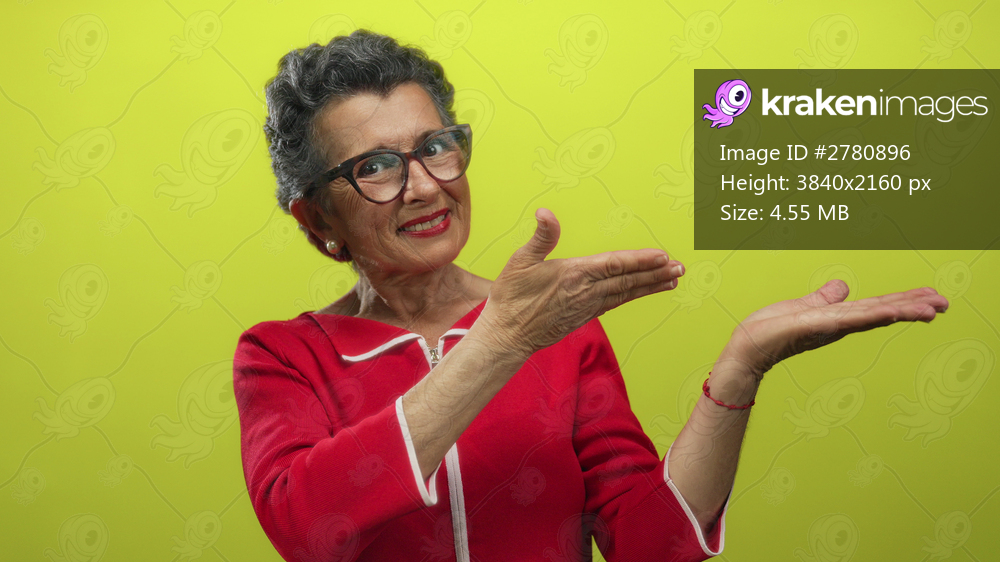 Senior woman with grey hair smiling in a red dress gestures with both hands against a vibrant yellow background, showcasing expression and positivity.