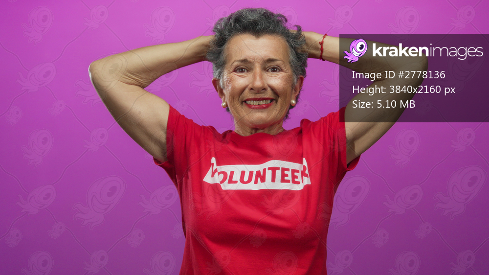 Senior woman with grey hair smiling in a red volunteer shirt holding her head with hands against a vibrant pink background exuding joy and positivity.