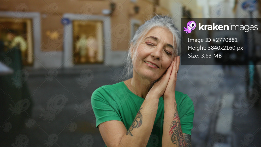 Senior woman with grey hair smiling and making a sleeping gesture with hands on a street, showcasing her tattoos in an outdoor setting.