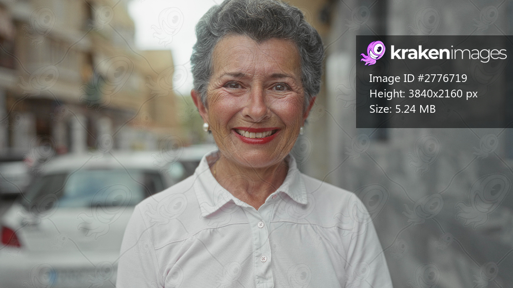 Senior woman with grey hair smiling on an urban street, wearing a white shirt with a background of city architecture and parked cars, creates an outdoor urban scene. - Kraken Images