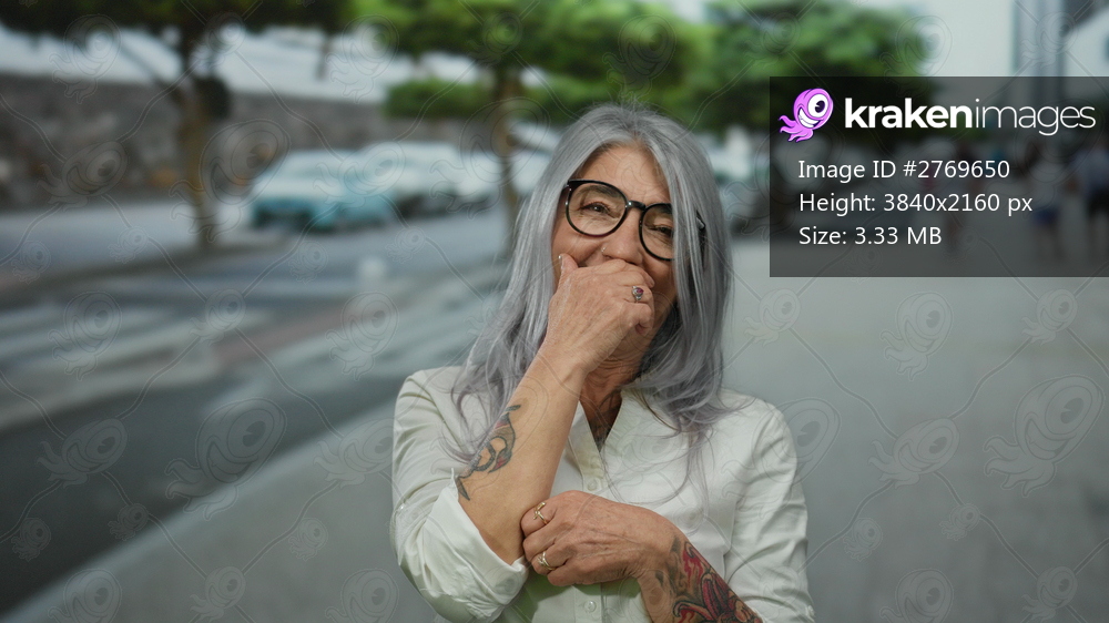 Senior woman with grey hair smiling outdoors on a city street with cars and trees in the background, showcasing a joyful and casual urban scene.