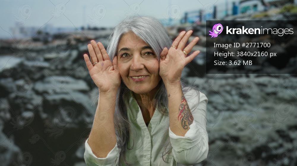 Senior woman with grey hair smiling and playfully covering her face at the seaside, showcasing joy and freedom against a rocky beach backdrop.