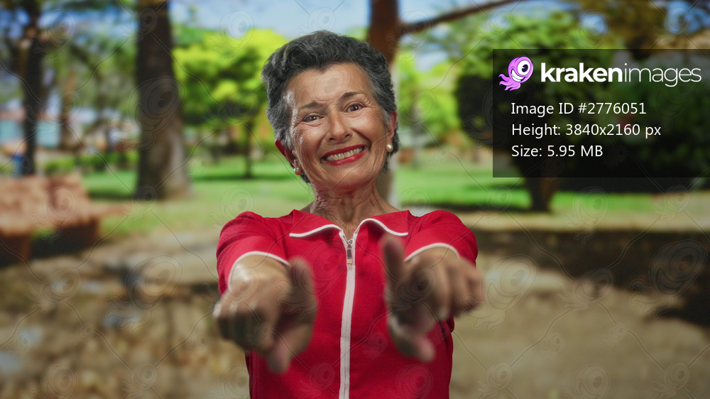 Senior woman with grey hair smiling and pointing at the camera in a vibrant park setting surrounded by lush greenery and trees.