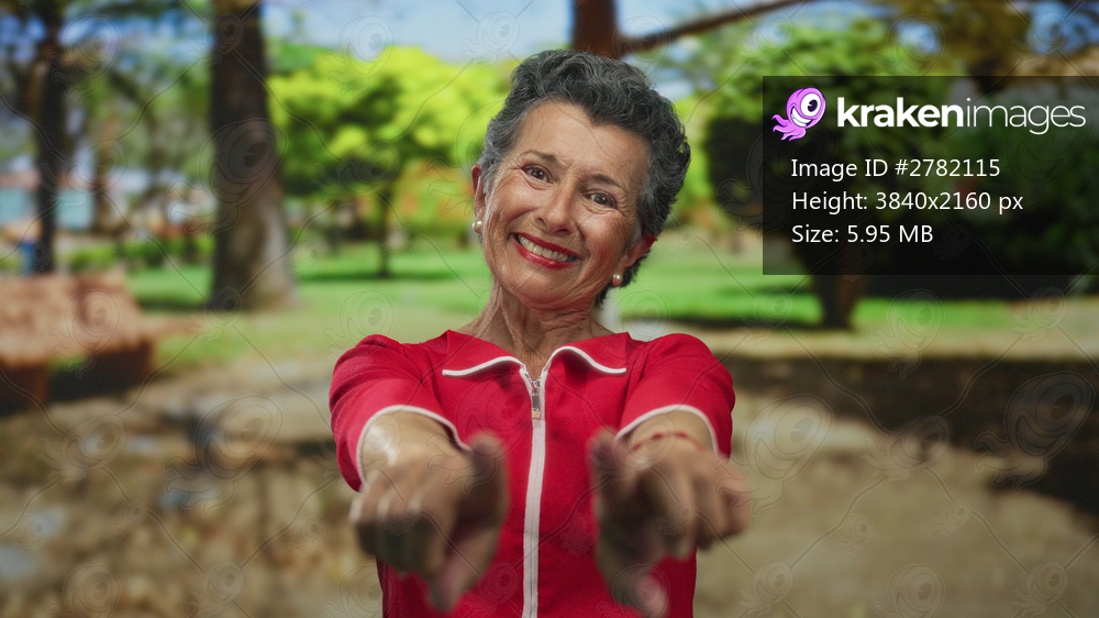 Senior woman with grey hair smiling and pointing at the camera in a vibrant park setting surrounded by lush greenery and trees.