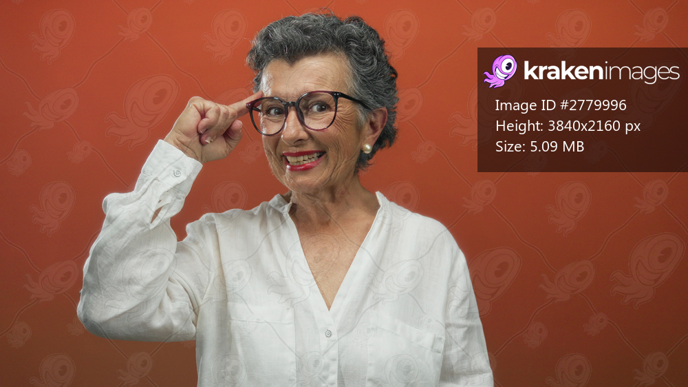 Senior woman with grey hair smiling and pointing to her head against an orange background, wearing glasses and a white shirt, conveying a thoughtful expression and confident attitude. - Kraken Images