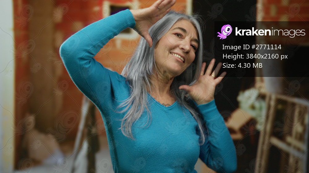 Senior woman with grey hair smiling and posing joyfully at an indoor construction site, showcasing happiness and energy against a backdrop of a partially built brick wall. - Kraken Images