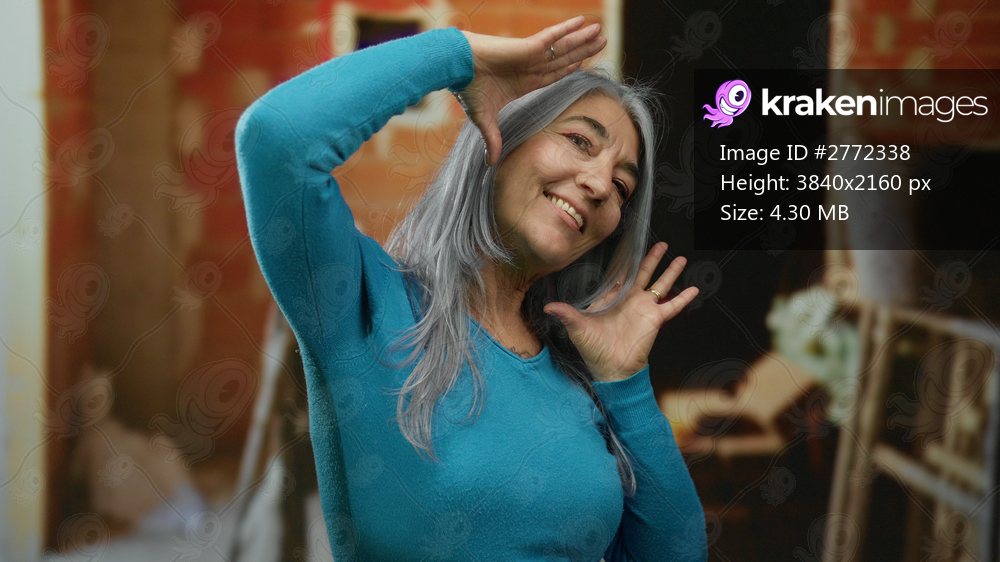 Senior woman with grey hair smiling and posing joyfully at an indoor construction site, showcasing happiness and energy against a backdrop of a partially built brick wall. - Kraken Images