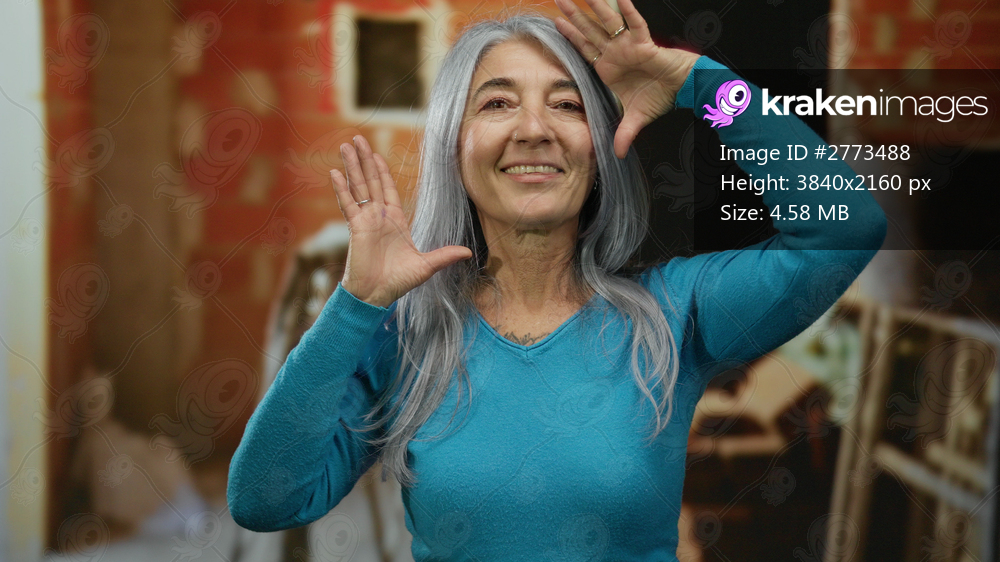 Senior woman with grey hair smiling and posing joyfully at an indoor construction site, showcasing happiness and energy against a backdrop of a partially built brick wall. - Kraken Images