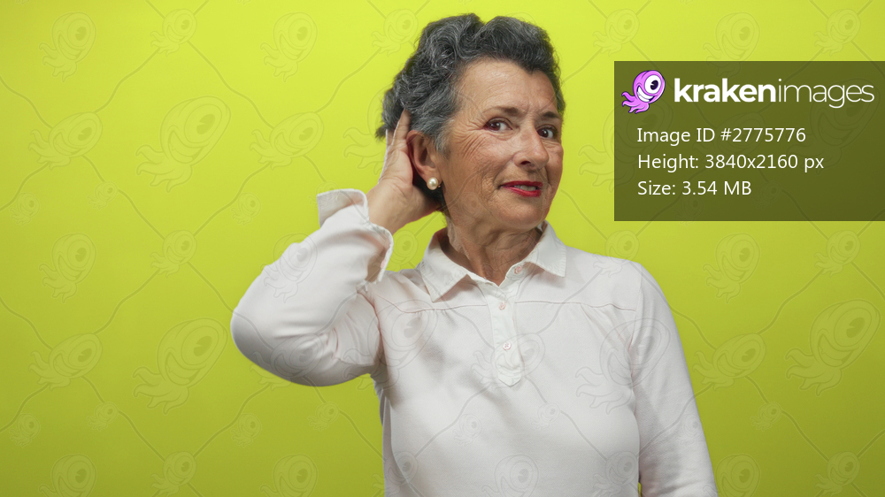 Senior woman with grey hair smiling and touching her hair against a vibrant yellow background, conveying confidence and joy.