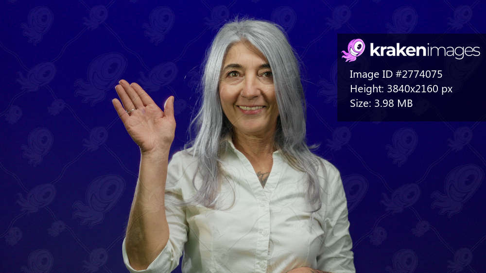 Senior woman with grey hair smiling and waving at the camera against a blue isolated background wall showcasing a friendly and inviting gesture.