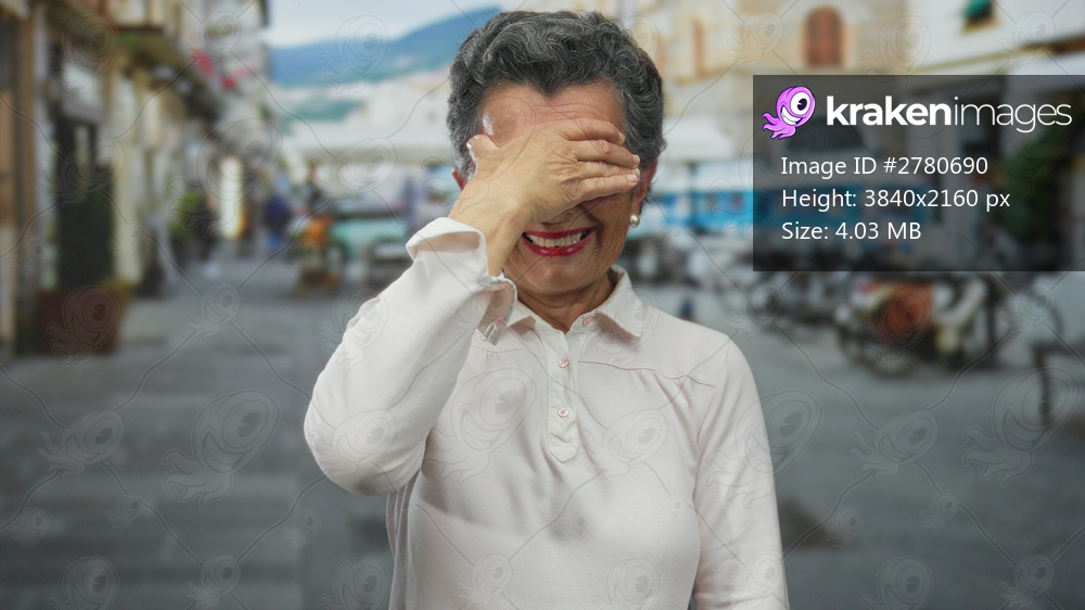 Senior woman with grey hair smiling while covering her eyes with her hand on a lively urban street, showcasing a joyful moment in a vibrant city setting. - Kraken Images