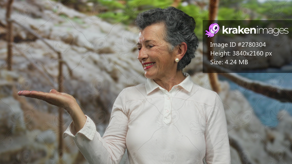 Senior woman with grey hair smiling while extending her hand on a seaside promenade, showcasing a vivid beach backdrop with rocky shores and green vegetation. - Kraken Images