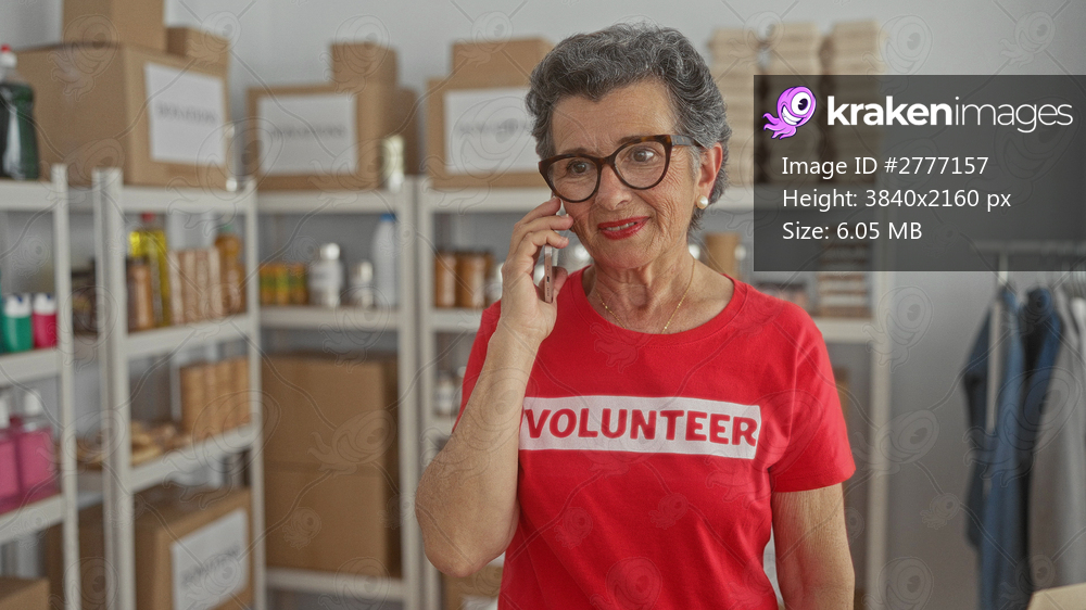 Senior woman with grey hair stands in a volunteer room, wearing a red volunteer shirt, talking happily on the phone while surrounded by boxes and supplies, conveying community service. - Kraken Images