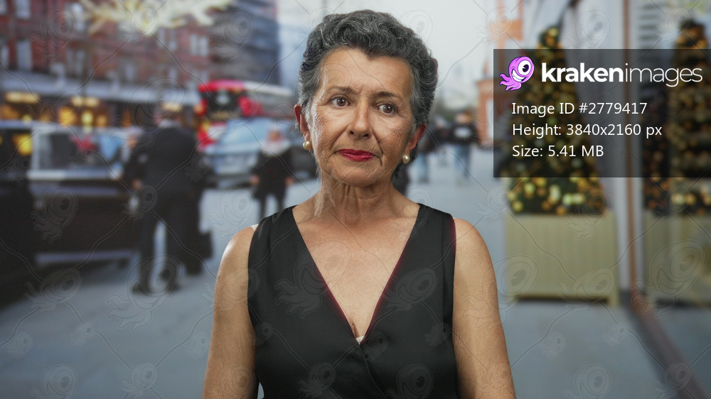 Senior woman with grey hair stands on an urban street decorated for the holidays, surrounded by blurred cityscape and christmas trees, embodying a festive, metropolitan vibe. - Kraken Images