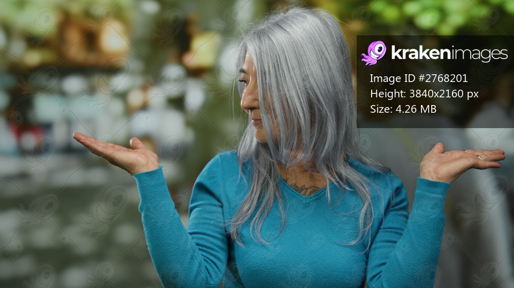 Senior woman with grey hair stands outdoors with hands extended, wearing a blue sweater against a blurred street background, embodying confidence and tranquility. - Kraken Images