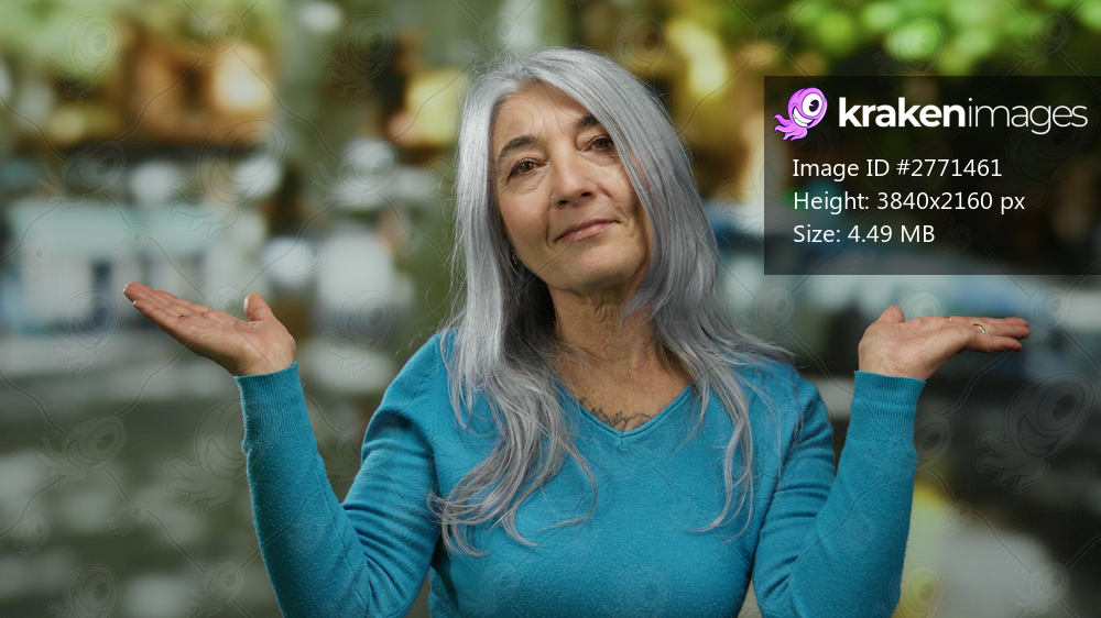 Senior woman with grey hair stands outdoors with hands extended, wearing a blue sweater against a blurred street background, embodying confidence and tranquility. - Kraken Images