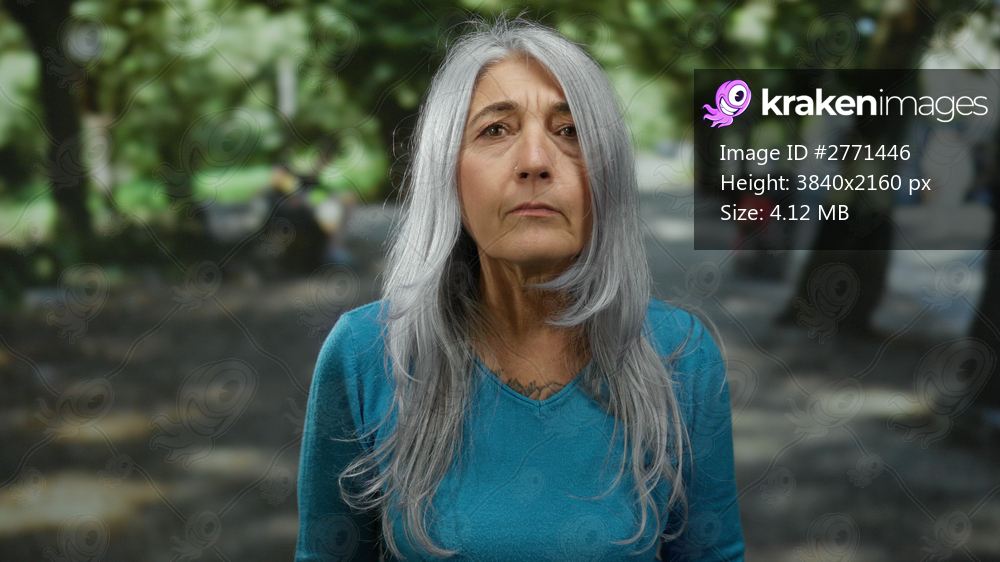 Senior woman with grey hair stands outdoors in a park, wearing a blue sweater, surrounded by lush green trees, conveying a sense of tranquility and nature. - Kraken Images