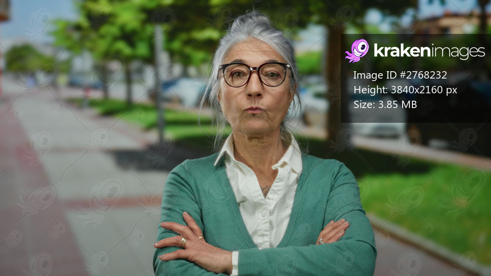 Senior woman with grey hair stands outdoors on a city street, arms crossed, wearing glasses and a green cardigan, embodying confidence amidst urban greenery and parked cars. - Kraken Images