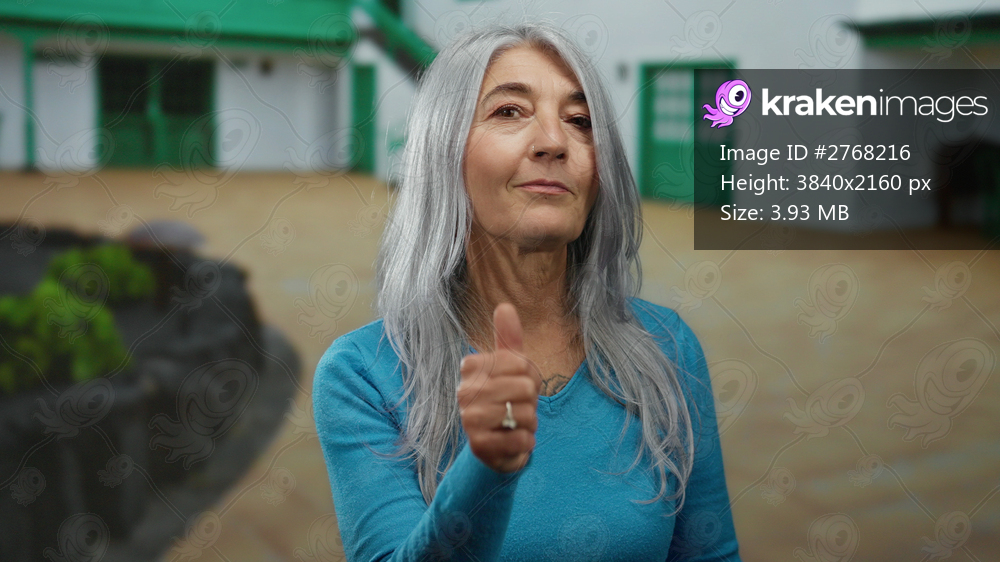 Senior woman with grey hair stands outdoors pointing with thumb up smiling on a sunny day in a street setting showcasing confidence and positivity in an urban environment - Kraken Images