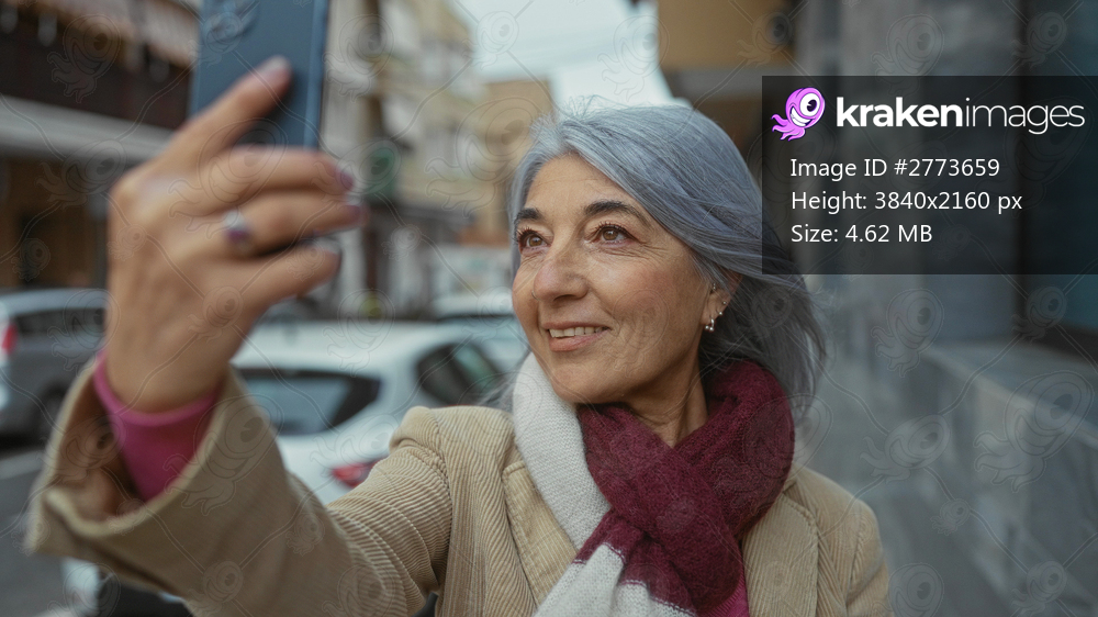 Senior woman with grey hair taking a selfie on a bustling street, capturing her joyful expression and peace sign, dressed warmly in a coat and scarf.