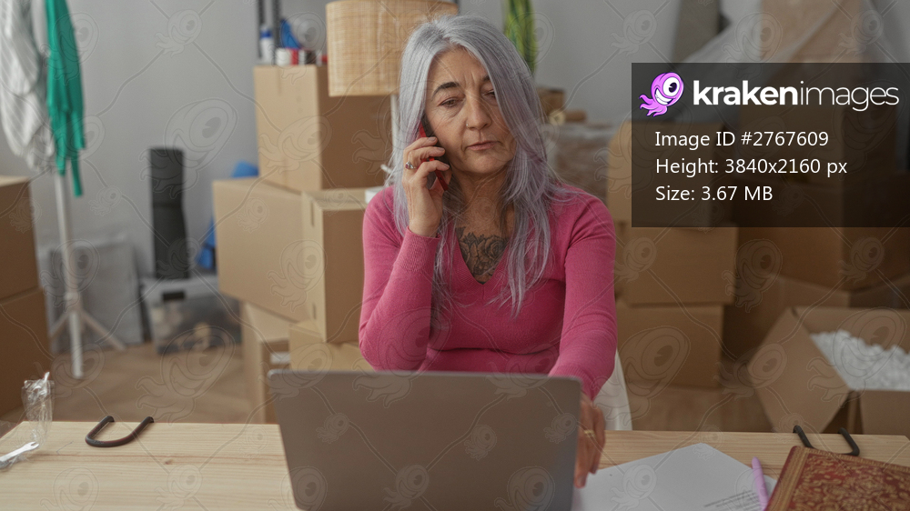 Senior woman with grey hair talking on phone while working on laptop in her new home surrounded by cardboard boxes, highlighting a modern, independent lifestyle transition. - Kraken Images