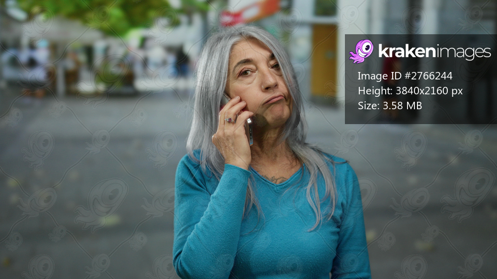 Senior woman with grey hair talks on phone outdoors in an urban street setting displaying thoughtful expression amidst blurred background of people and buildings - Kraken Images