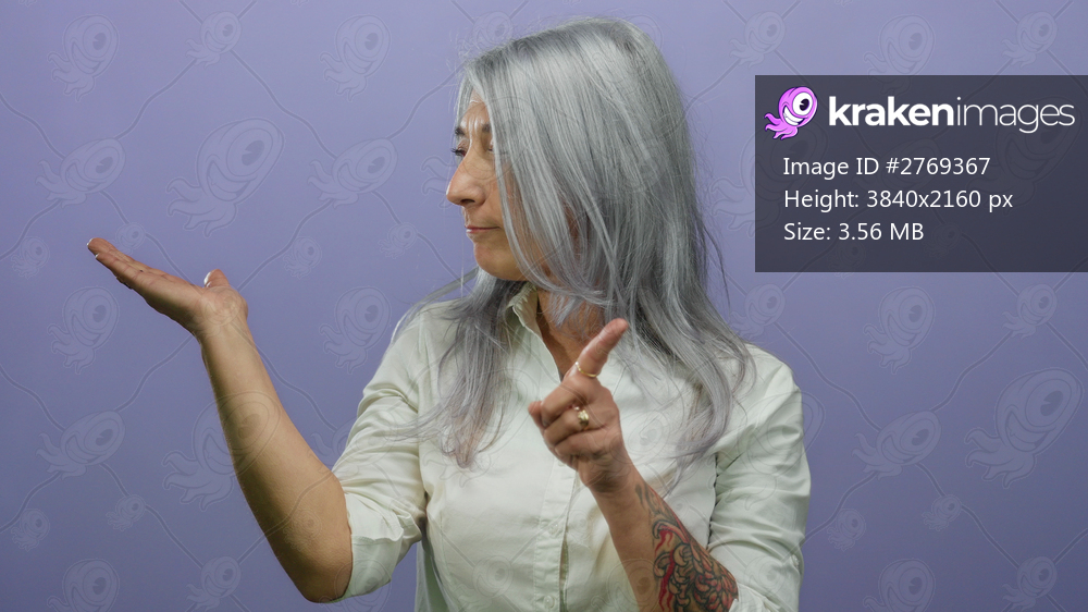 Senior woman with grey hair, tattooed arm extended, gesturing no with finger against a purple background, conveying caution or disagreement.