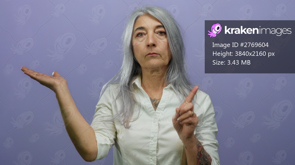Senior woman with grey hair, tattooed arm extended, gesturing no with finger against a purple background, conveying caution or disagreement.
