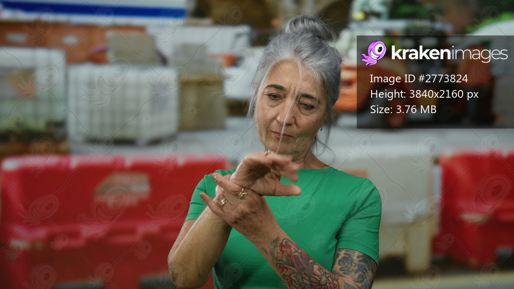 Senior woman with grey hair and tattoos examines her wrist attentively at a bustling outdoor construction site.