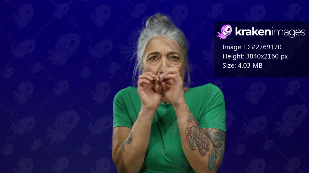 Senior woman with grey hair and tattoos expressing uncertainty on an isolated blue background.