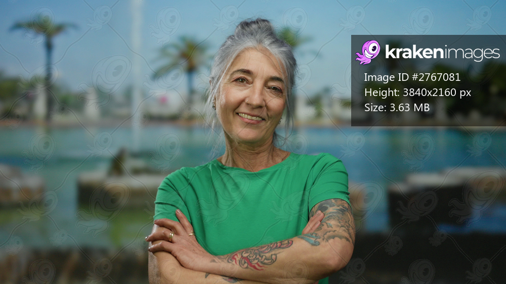 Senior woman with grey hair and tattoos smiles confidently in a green shirt while standing in a park with a fountain and palm trees.