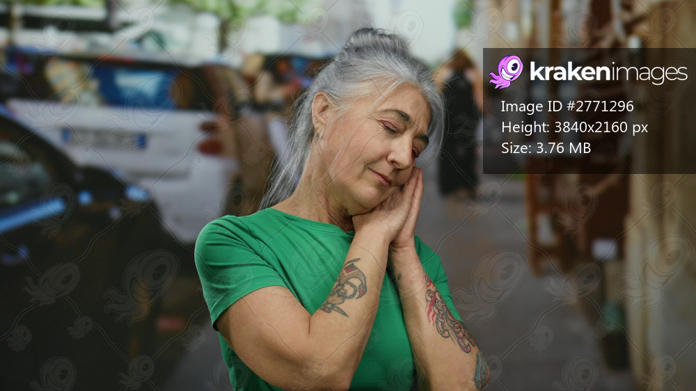 Senior woman with grey hair and tattoos stands peacefully with eyes closed on a busy city street, surrounded by cars and urban scenery, evoking a sense of calm and mindfulness. - Kraken Images