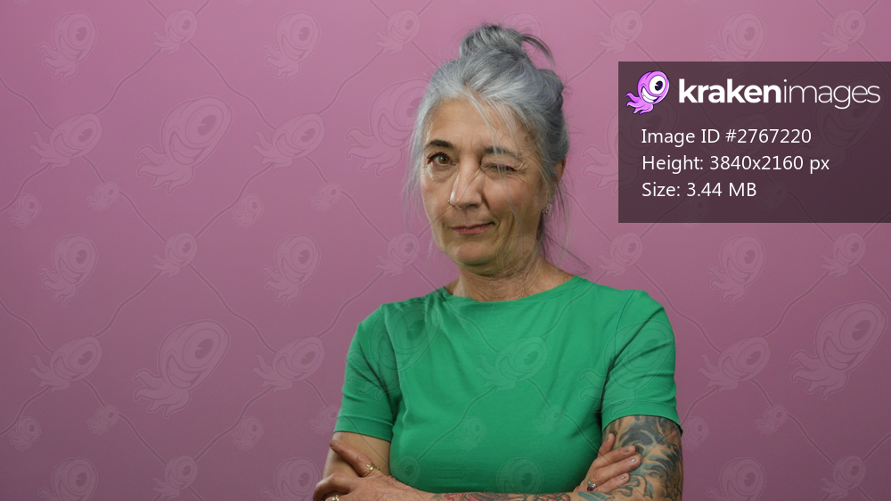 Senior woman with grey hair and tattoos winking playfully with crossed arms against a vibrant pink background.