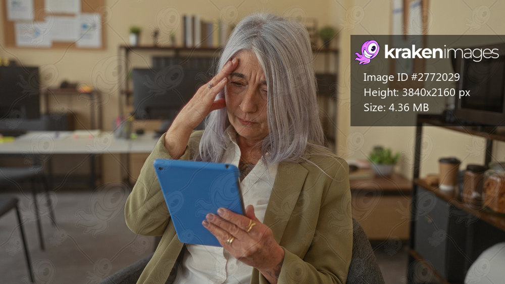 Senior woman with grey hair using a tablet in an office setting, exhibiting focus and concentration, seated amidst a cozy, well-organized workplace interior with decor and plants. - Kraken Images