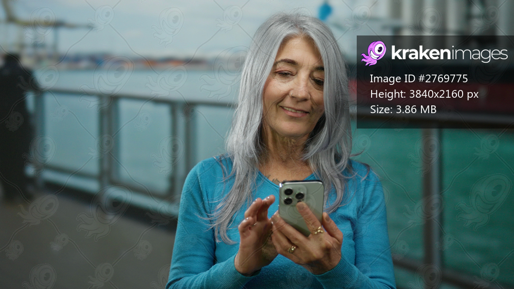 Senior woman with grey hair using phone on a cruise boat against seaside backdrop, enjoying a tranquil moment outdoors with a candid smile.