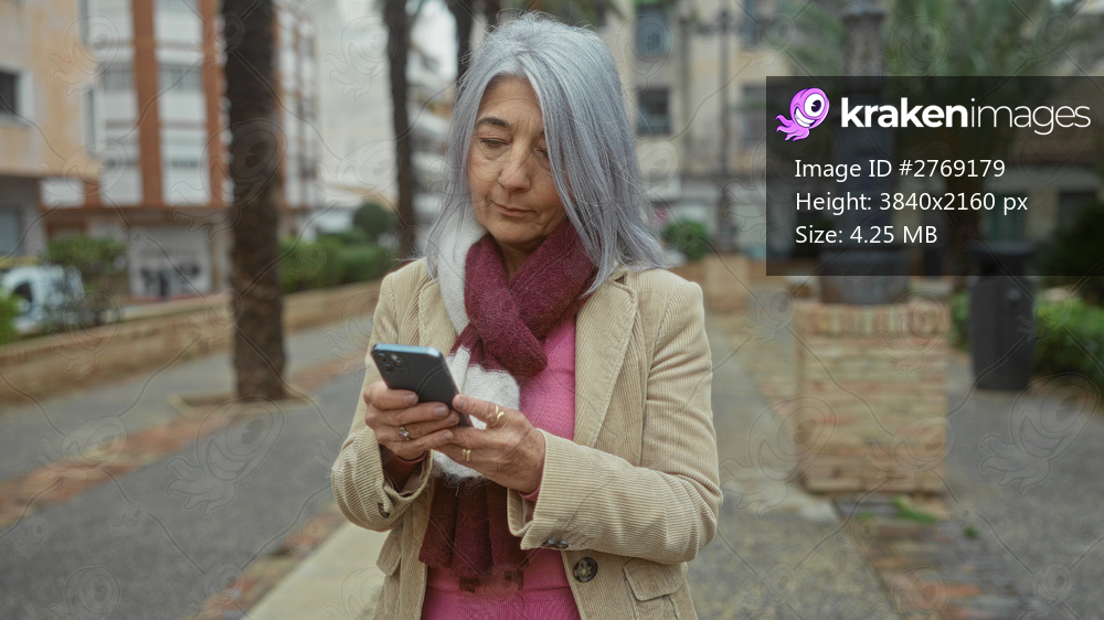 Senior woman with grey hair using smartphone outdoors on city street surrounded by urban buildings and palm trees, dressed warmly in scarf and coat on an overcast day. - Kraken Images