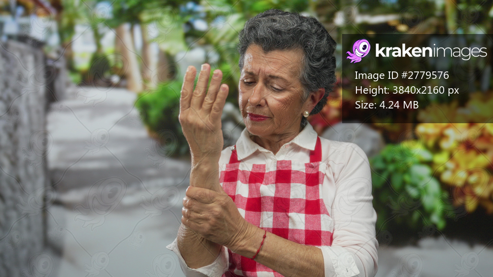 Senior woman with grey hair wearing a checkered apron stands outdoors on a city street examining her sore wrist under bright urban greenery.