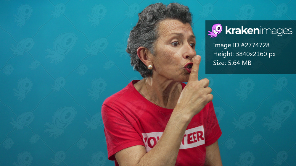 Senior woman with grey hair wearing a red volunteer shirt gestures for silence against a blue background, embodying community involvement and communication. - Kraken Images