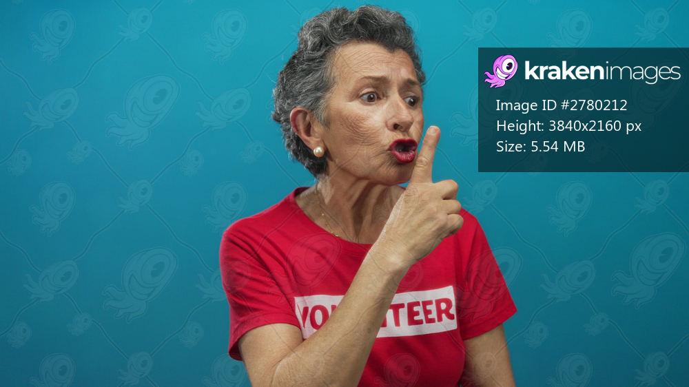 Senior woman with grey hair wearing a red volunteer shirt gestures for silence against a blue background, embodying community involvement and communication. - Kraken Images
